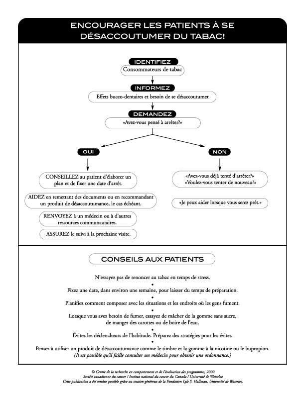 Une première au Canada En 1996, 54 dentistes de l’Alberta ont accepté de participer à une étude aléatoire contrôlée d’une durée de 2 ans afin d’évaluer un programme éducatif visant à améliorer les SDT offerts par les cabinets dentaires11-13. Les cabinets ont été répartis au hasard en un groupe d’intervention ou de contrôle. Dans le cadre du groupe d’intervention, on a remis aux participants un manuel sur la désaccoutumance au tabac à l’intention du cabinet dentaire, ainsi que des documents éducatifs à l’intention des patients. On a aussi demandé l’avis des patients et communiqué à des collègues par le biais de téléconférences. Cette façon de procéder était très importante : la possibilité d’échanger avec d’autres, d’exprimer ses inquiétudes, de discuter de stratégies avec des collègues et de connaître la réaction des patients face à la mise sur pied de SDT se révélait essentielle à l’adoption d’une nouvelle pratique.