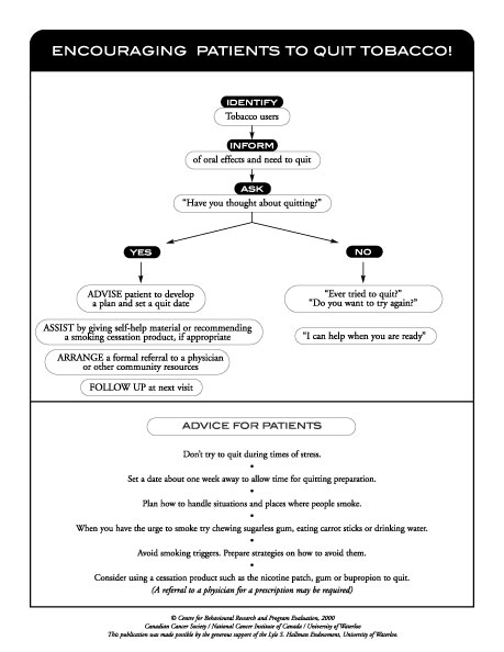 The final major barrier identified by our study participants was lack of both patient education materials and referral resources. Most dental offices work in the realm of private practice and may be unaware of community resources that can be accessed by smokers. Three of the major health charities (Canadian Lung Association, Heart and Stroke Foundation of Canada, Canadian Cancer Society) provide self-help cessation materials. Smokers can be referred to these organizations or their materials ordered and displayed in the office reception area. Displaying self-help materials not only identifies a practice as supporting cessation but encourages patients to approach staff about quitting. Many patients would do so if they knew help was available. The Canadian Cancer Society also operates a toll-free cancer information service (1-888-939-3333) throughout Canada. Assistance, self-help materials and referral to other resources are provided by trained information specialists. The local public health unit will be knowledgeable of other programs and resources within the community. A patient’s family doctor is also an important player in cessation efforts and can be a useful ally in providing TCS. Helping patients quit is not something the dental office has to do alone — there are many community resources available and a simple phone call can link the dental office to a network of tobacco resources.