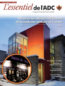 Responsable de la gouvernance et des communications Zelda Burt Chef de la rédaction Sean McNamara Rédacteurs-réviseurs Sierra Bellows Gabriel Fulcher Pauline Mérindol Spécialiste des publications Michelle Bergeron Concepteur graphique Carlos Castro Publicité de Pour toute demande concernant les annonces publicitaires, les annonces en ligne et les petites annonces, ou pour obtenir le dossier de presse 2026 de l’ADC, veuillez contacter : Michelle Bergeron, Spécialiste des publications de l’ADC mbergeron@cda-adc.ca L’essentiel de l’ADC est disponible en ligne à l'adresse cda-adc.ca/fr/ essentials. Toutes les annonces publicitaires et petites annonces sont incluses dans la version PDF complète, avec des liens directs vers les sites Web des entreprises/ produits. La version en ligne L’essentiel de l’ADC génère plus de 21 000 pages vues par mois. Point de contact de Michelle Bergeron, Spécialiste des publications de l’ADC mbergeron@cda-adc.ca Courriel de L’essentiel de l’ADC : publications@cda-adc.ca Avis de changement d’adresse à envoyer à : reception@cda-adc.ca ou publications@cda-adc.ca cda-adc.ca L’essentiel de l’ADC est publié par l’Association dentaire canadienne dans les deux langues officielles. Entente d’envoi de poste-publications no 40064661. Retour des envois non distribuables aux adresses canadiennes à : Association dentaire canadienne, 1815, promenade Alta Vista, Ottawa (Ontario) K1G 3Y6. ISSN 2292-7387 (version imprimée) ISSN 2292-7395 (version électronique) © Association dentaire canadienne 2026 Photo de couverture : avec l’aimable autorisation du Musée canadien des sciences de la santé Avis de non-responsabilité Les collaborateurs assument l’entière responsabilité de leurs opinions et des faits dont ils font état et ceux-ci n’expriment pas nécessairement les opinions de l’Association dentaire canadienne (ADC). La publication d’une annonce commerciale ne signifie pas nécessairement que l’ADC en appuie ou en endosse le contenu. L’équipe éditoriale se réserve le droit de corriger les textes soumis pour publication dans L’essentiel de l’ADC. De plus, l’ADC ne peut être tenue responsable des erreurs de texte ou de traduction. Le contenu commandité est créé exclusivement par les annonceurs, en partenariat avec PGMPI. L’équipe éditoriale de L’essentiel de l’ADC n’intervient pas dans sa création. Conseil d’administration de l’ADC Président Dr Bruce Ward Dre Lesli Hapak Ontario Énoncé de mission de l’ADC Fondée en 1902, l’ADC est une organisation constituée sans but lucratif et en vertu d’une loi fédérale, et dont les membres corporatifs sont les associations dentaires provinciales et territoriales (ADPT) du Canada. L’ADC représente plus de 21 000 praticiens d’un océan à l’autre et est une marque et une source d’information fiable pour et sur la profession dentaire concernant des questions nationales et internationales. est la publication imprimée officielle de l’ADC, offrant un dialogue entre l’association nationale et la communauté dentaire. Le magazine sert à informer les dentistes au sujet d’actualités, de nouvelles cliniques et d’enjeux pertinents à la profession. Dr Brian Baker Saskatchewan Président désigné Dr Kirk Preston Vice-président Dr Jason Noel Dre Joy Carmichael Nouveau-Brunswick Dr Jerrold Diamond Alberta Dre Mélissa Gagnon-Grenier T.N.-O./Nunavut/Yukon Dr Raymon Grewal Colombie-Britannique Dre Janice Stewart Île-du-Prince-Édouard Dr Paul Hurley Terre-Neuve-et-Labrador Dr Stuart MacDonald Nouvelle-Écosse Dr Marc Mollot Manitoba 2026 • Volume 13 • Numéro 1 @CdnDentalAssoc canadian-dentalassociation Canadian Dental Association cdndentalassoc cdaoasis 3 Numéro 1 | 2026 |